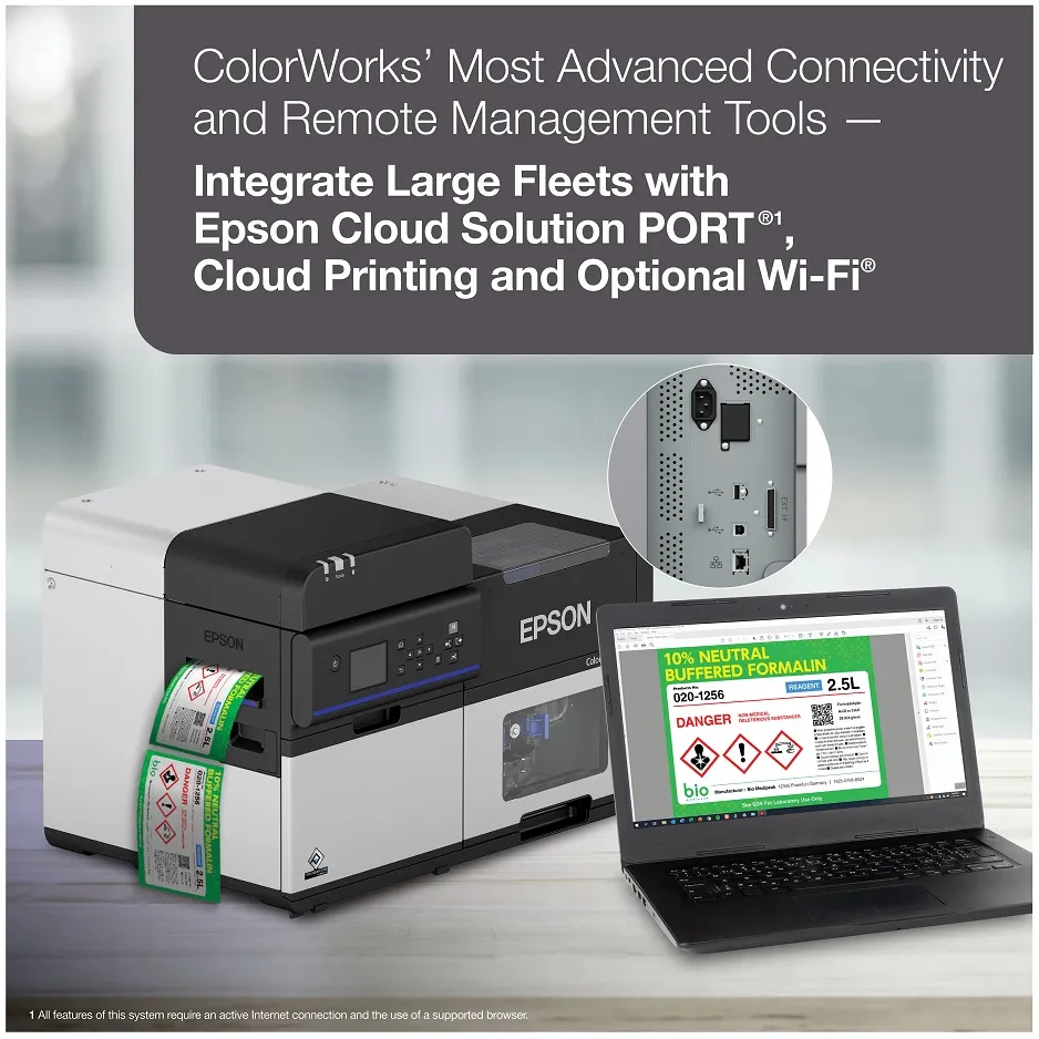 Epson ColorWorks printers combine PrecisionCore Heat Free technology, BS5609 capable pigment inks, and easy integration with ZPL II, SAP, Windows, Mac, and Linux. Pacific Barcode stocks every Epson model, supports install and setup, and provides inks, media, accessories and roll to roll systems so you can print the right label the first time.